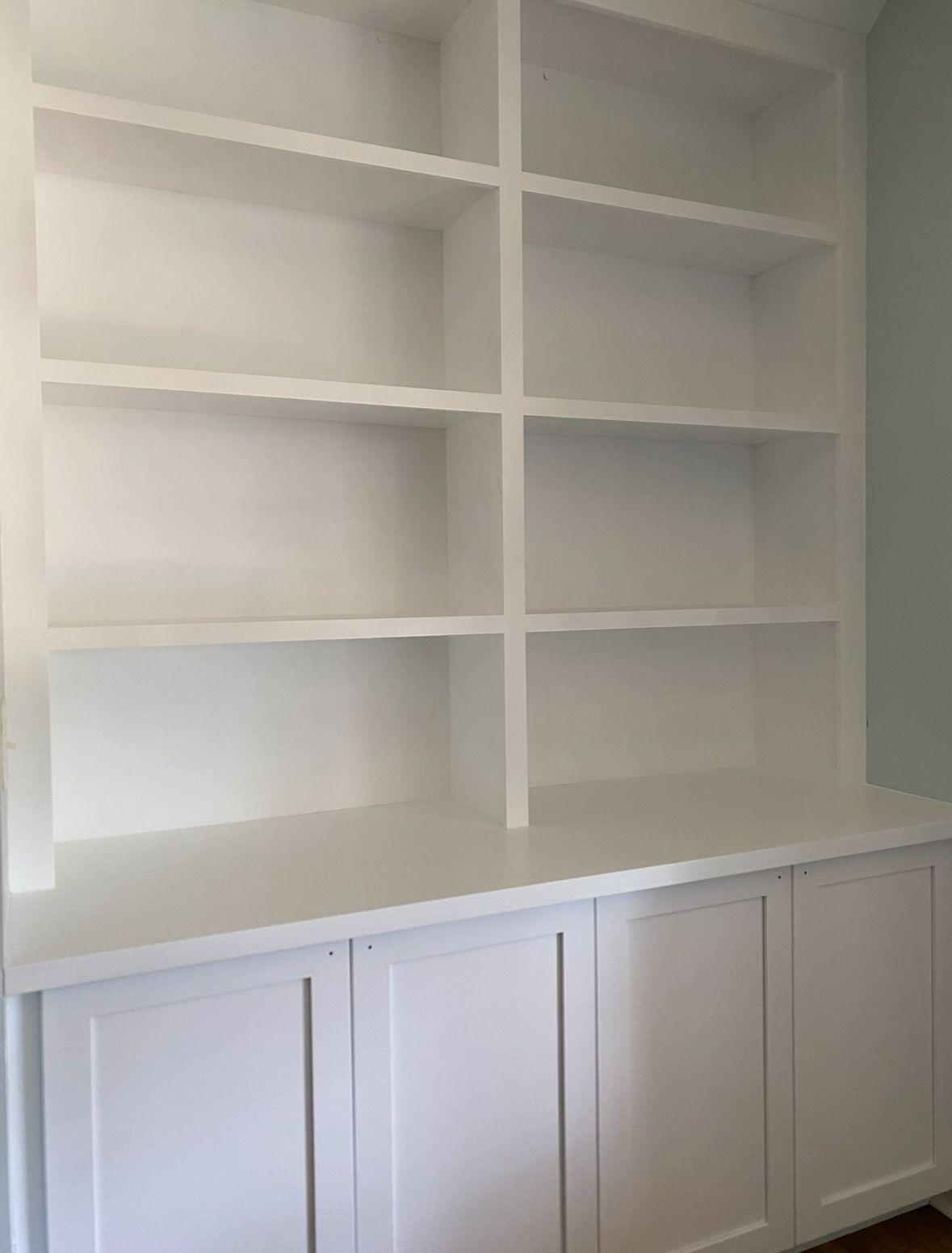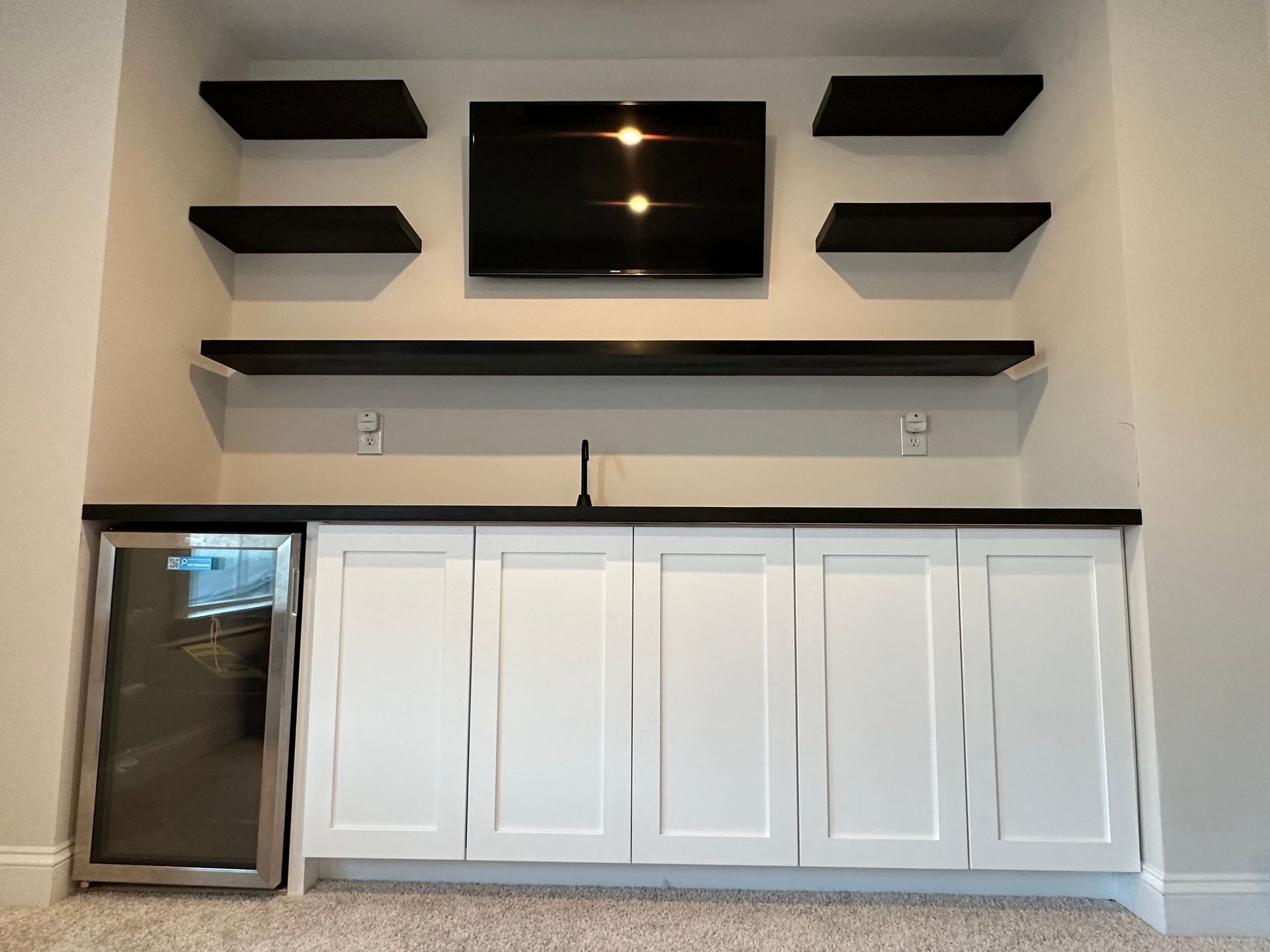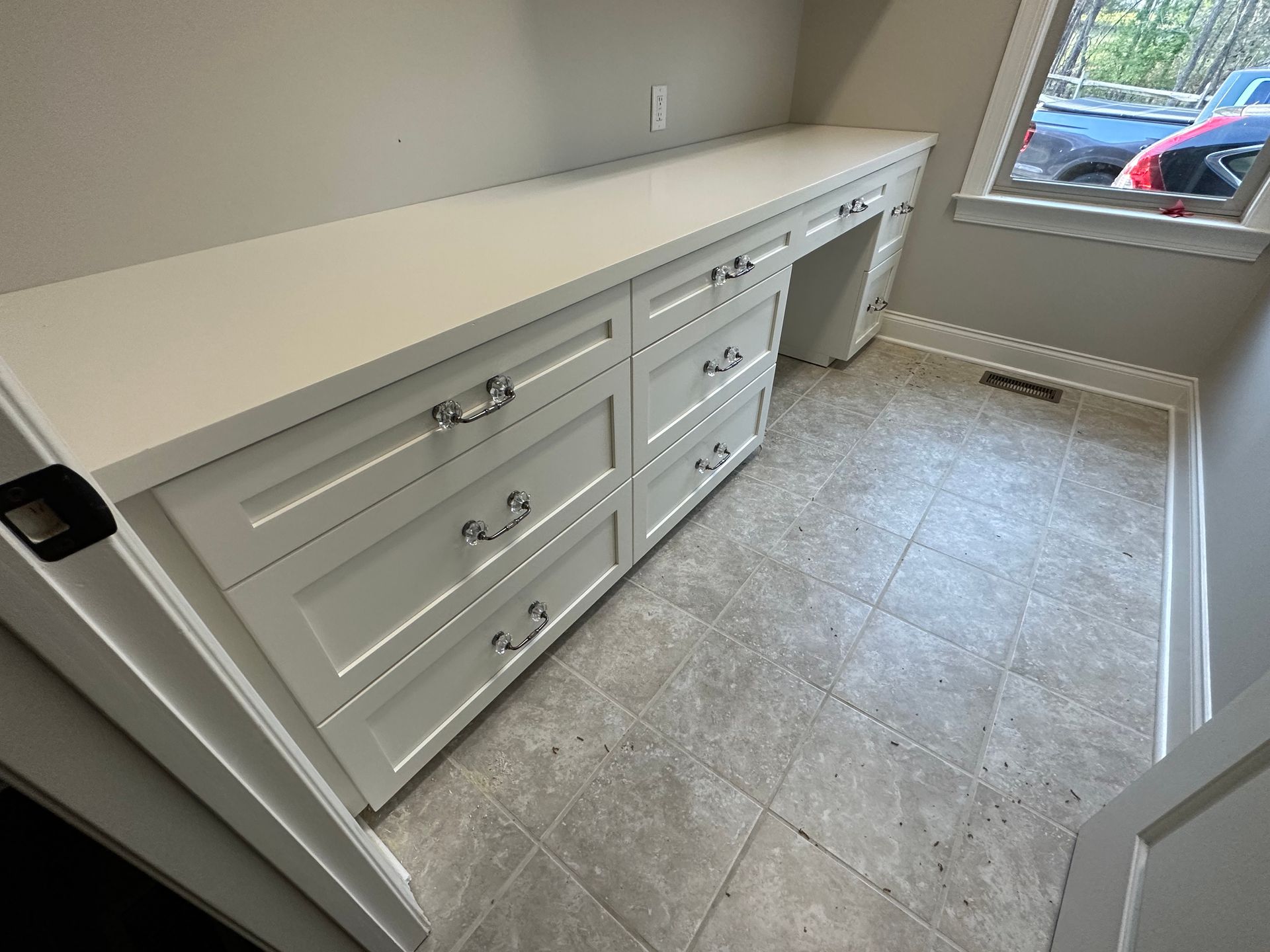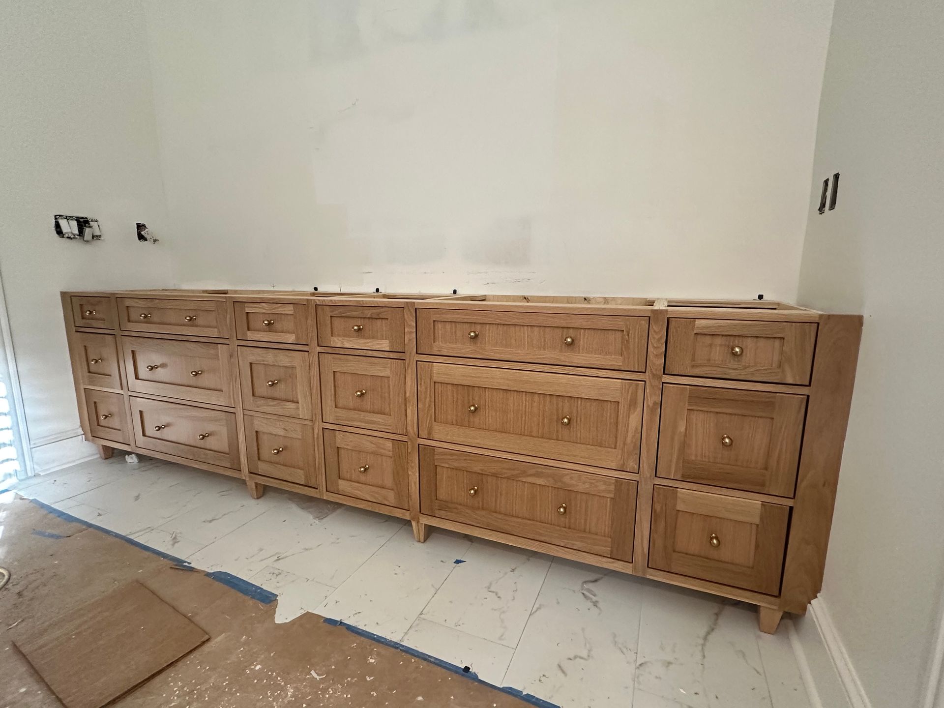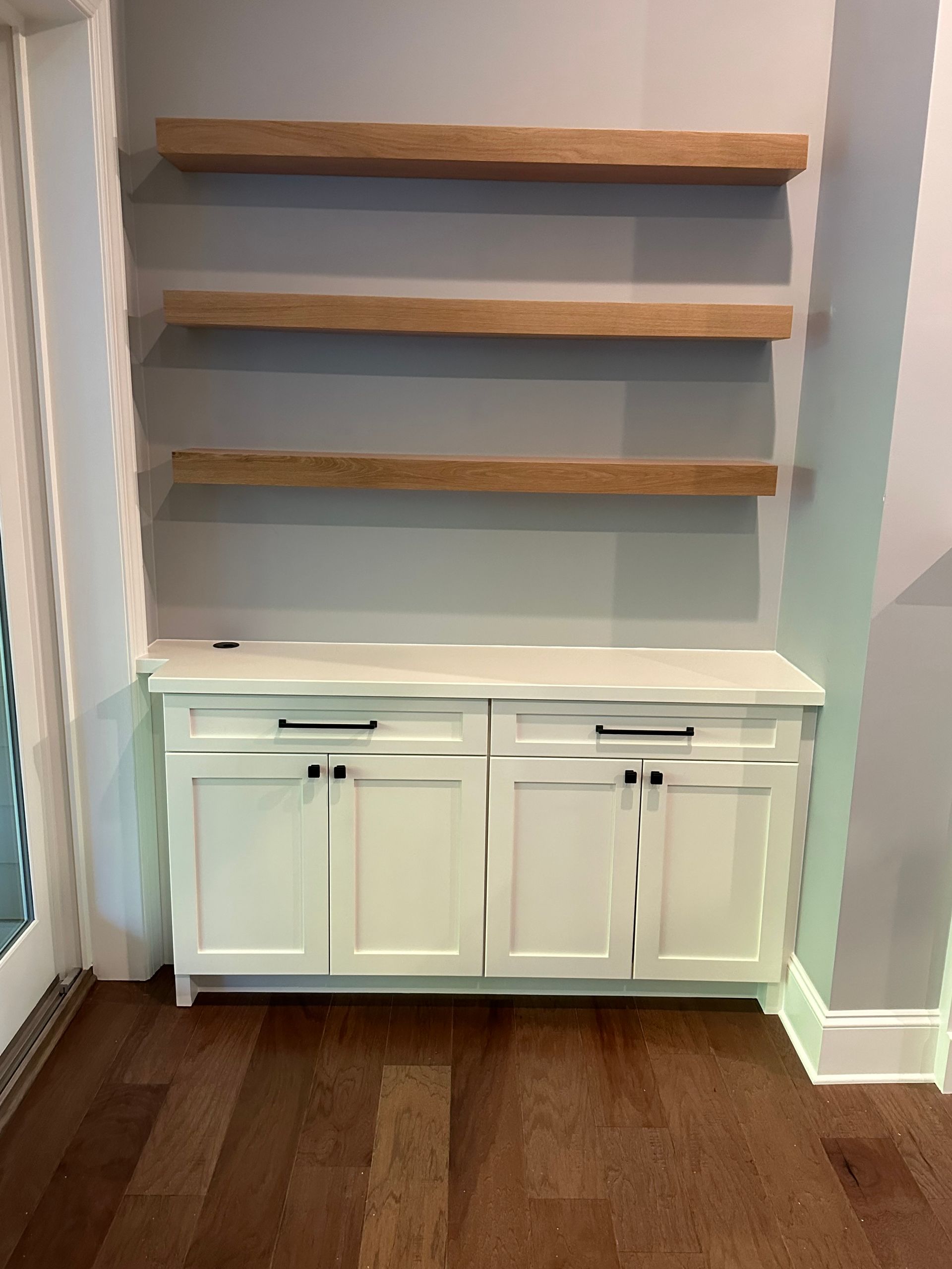 We are available to design, build and install any type of cabinetry you may need for your home. Examples of cabinets we offer: bathroom vanities, kitchen cabinetry, laundry room cabinetry, built-in shelving for your living room or home office, closet shelving and cabinetry, garage storage, etc.