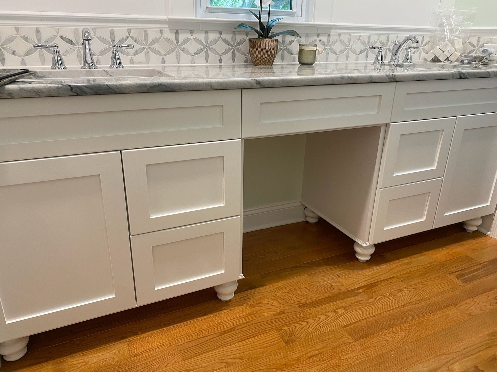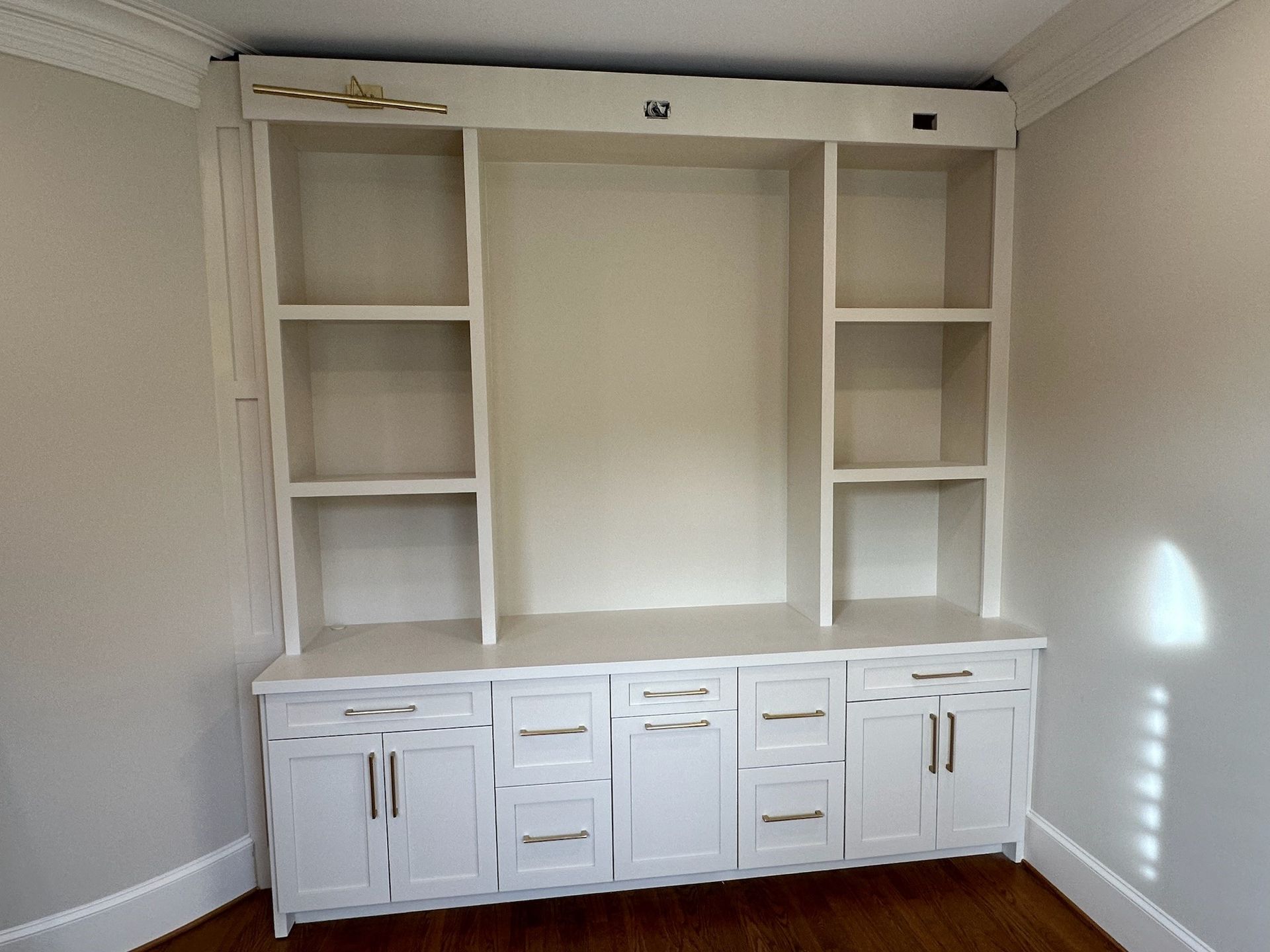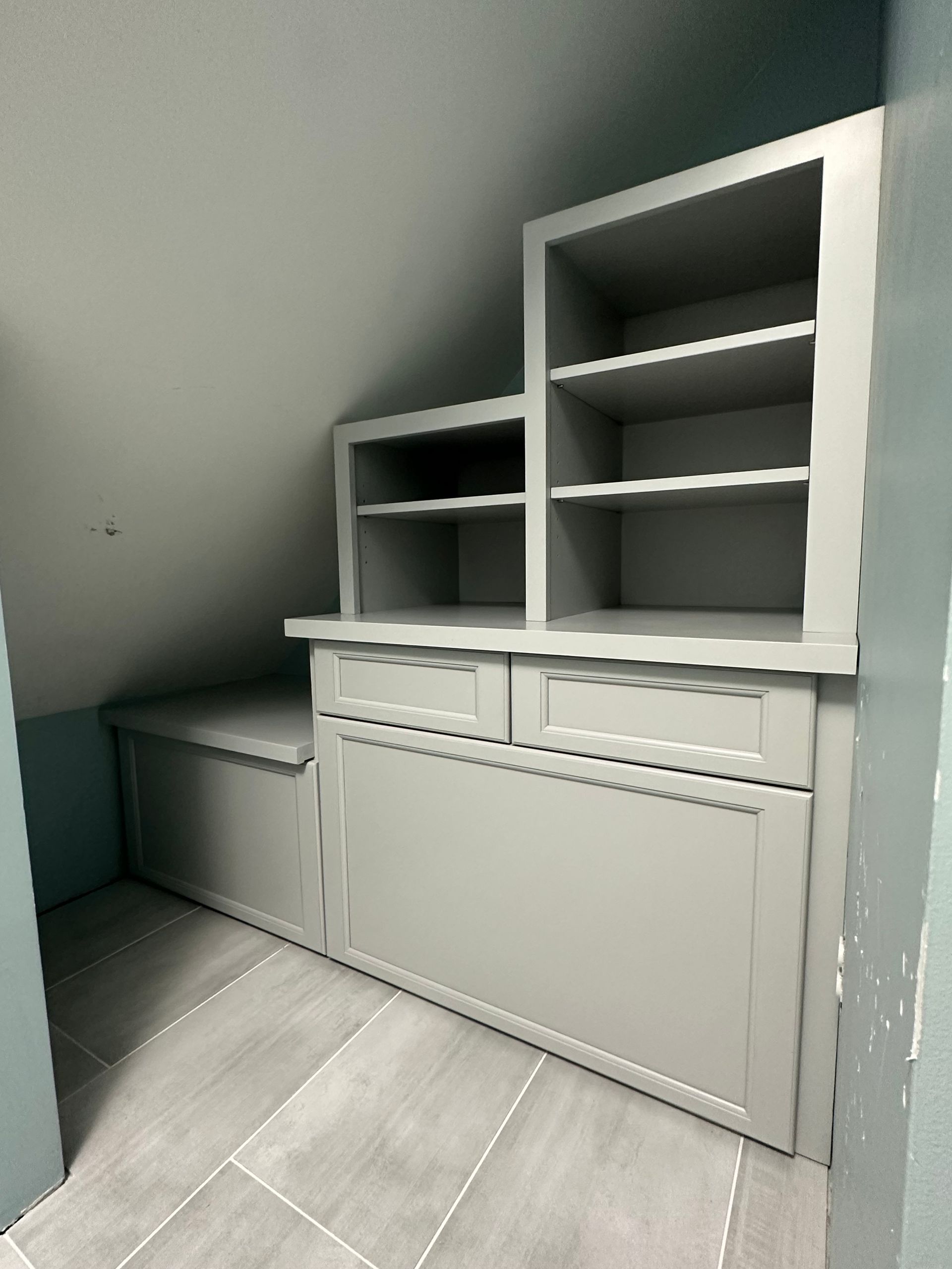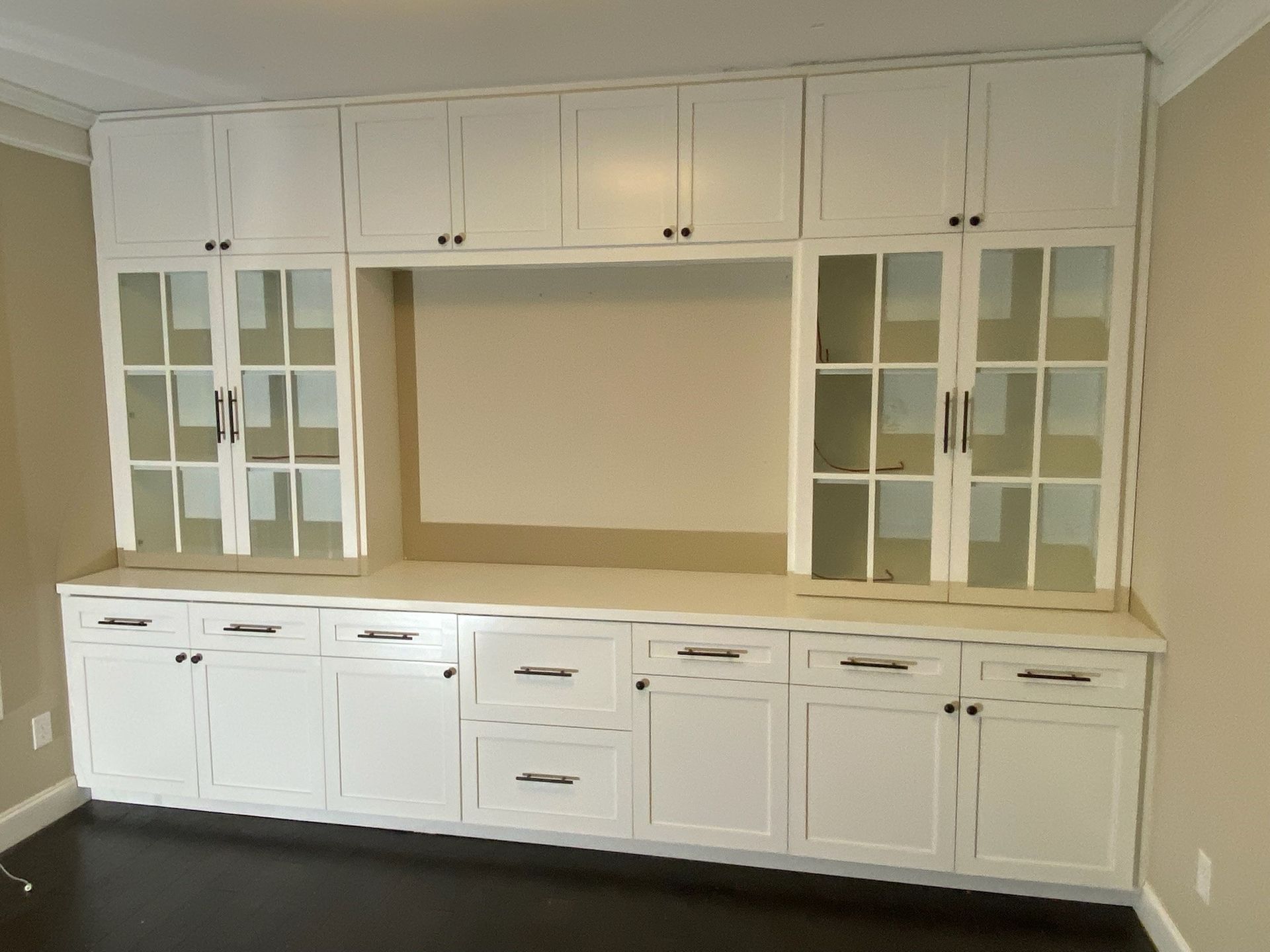 We are available to design, build and install any type of cabinetry you may need for your home. Examples of cabinets we offer: bathroom vanities, kitchen cabinetry, laundry room cabinetry, built-in shelving for your living room or home office, closet shelving and cabinetry, garage storage, etc.