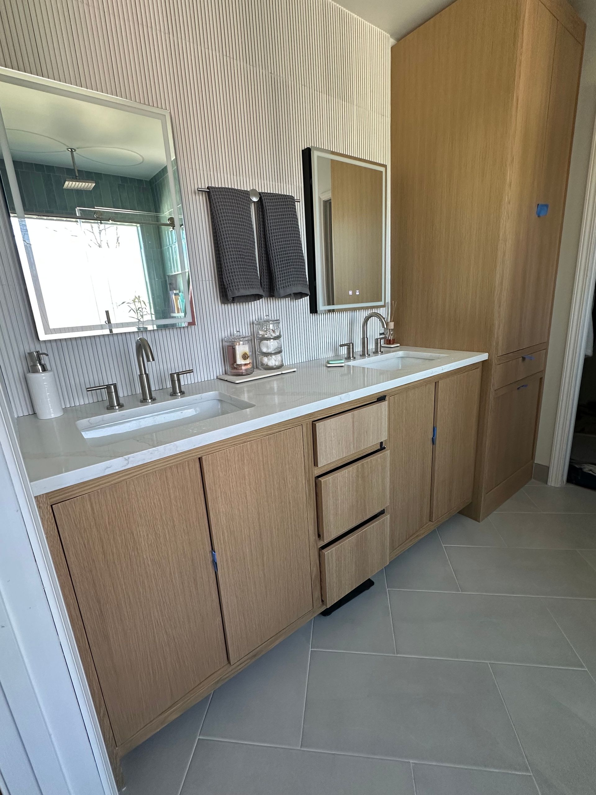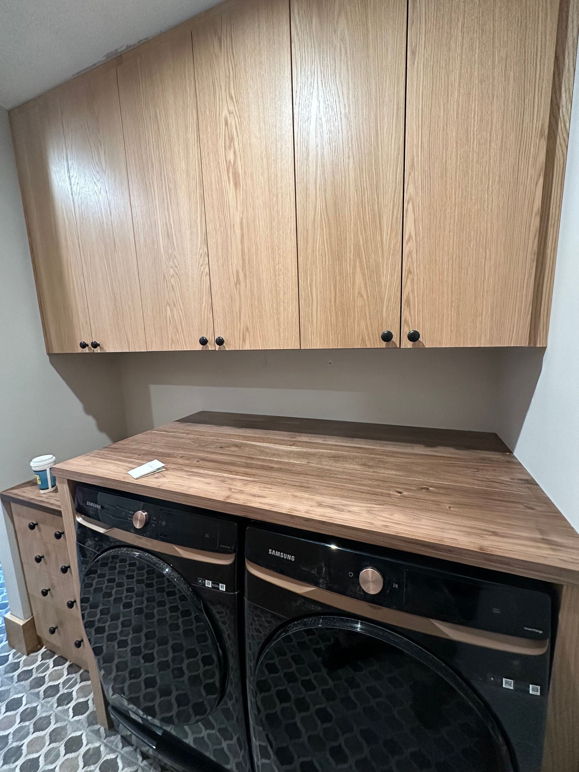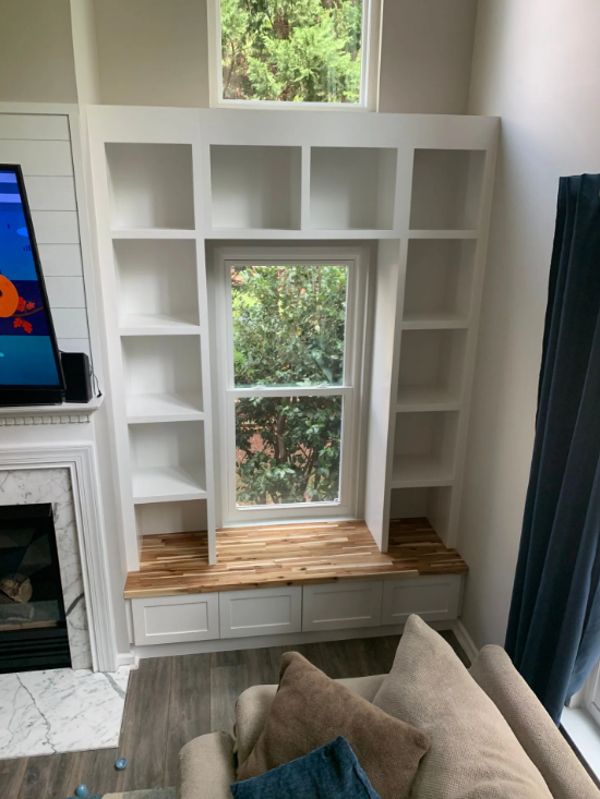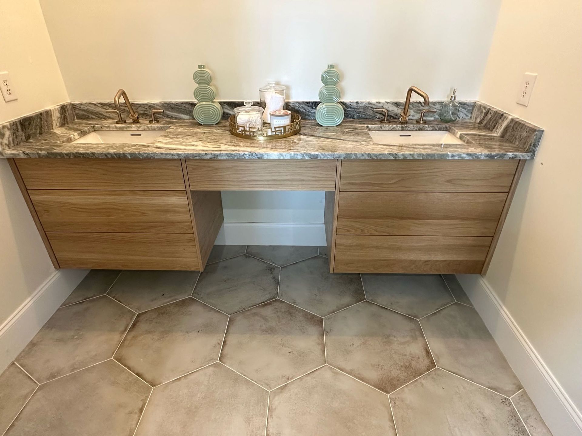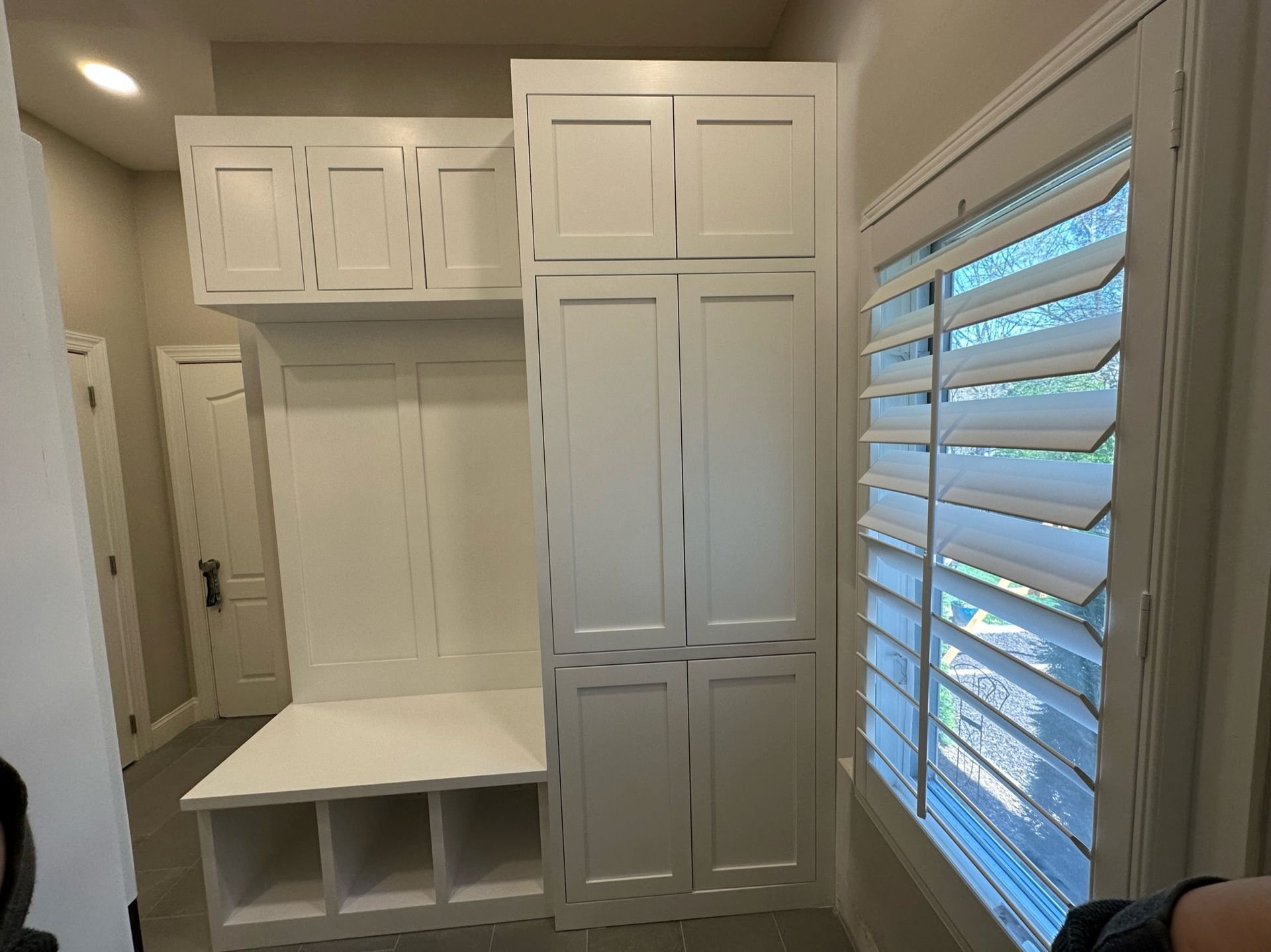 We are available to design, build and install any type of cabinetry you may need for your home. Examples of cabinets we offer: bathroom vanities, kitchen cabinetry, laundry room cabinetry, built-in shelving for your living room or home office, closet shelving and cabinetry, garage storage, etc.
